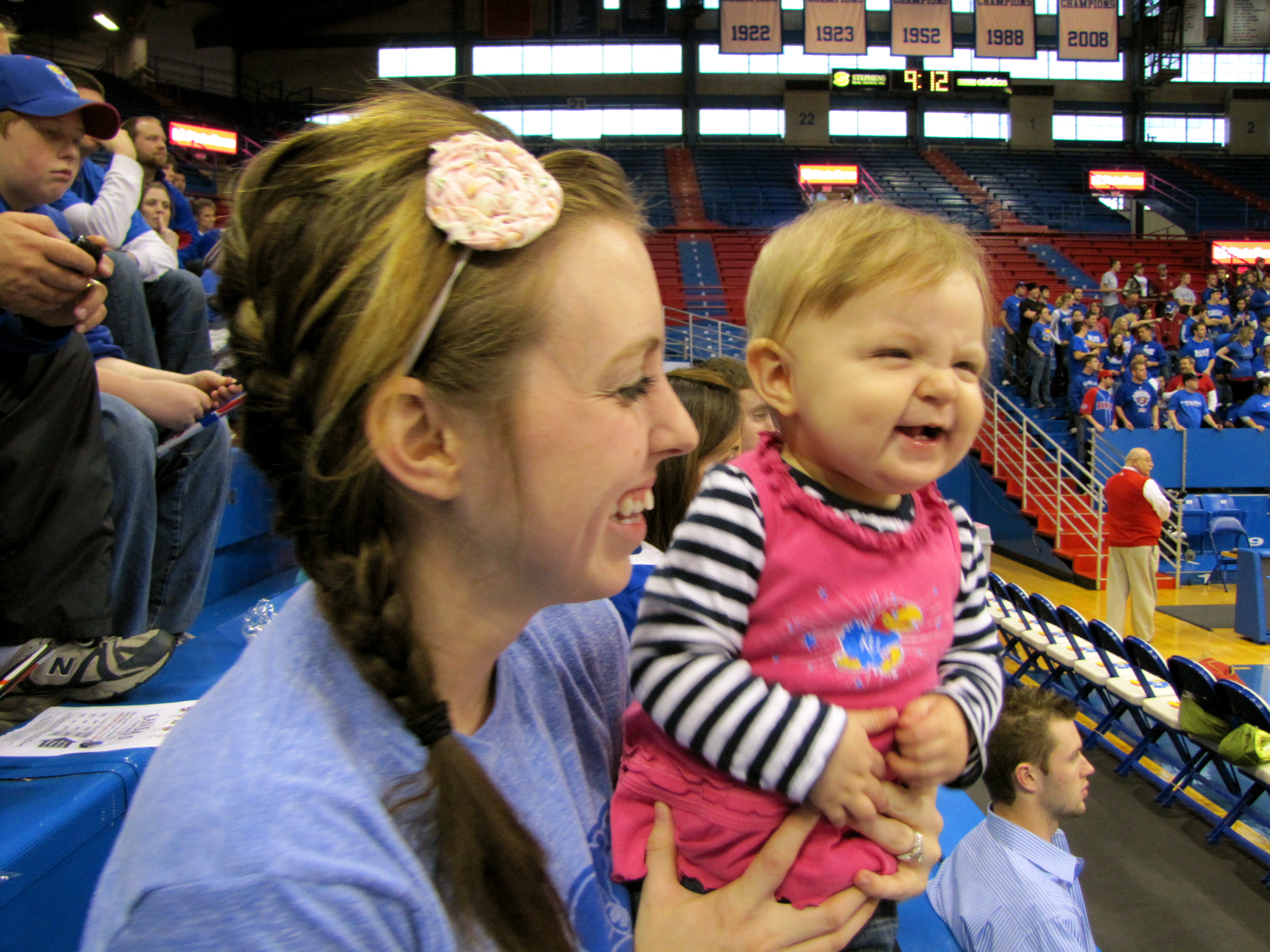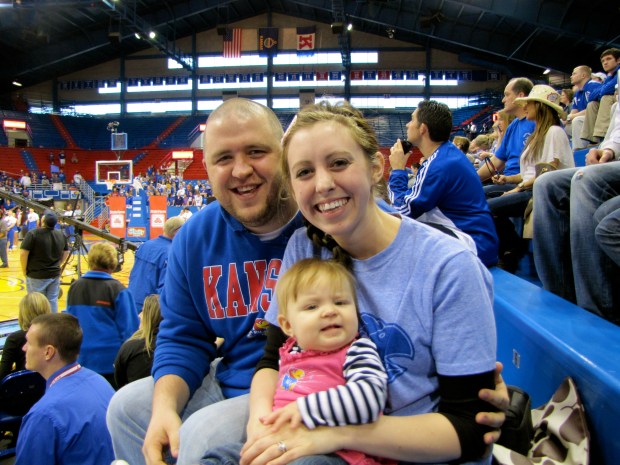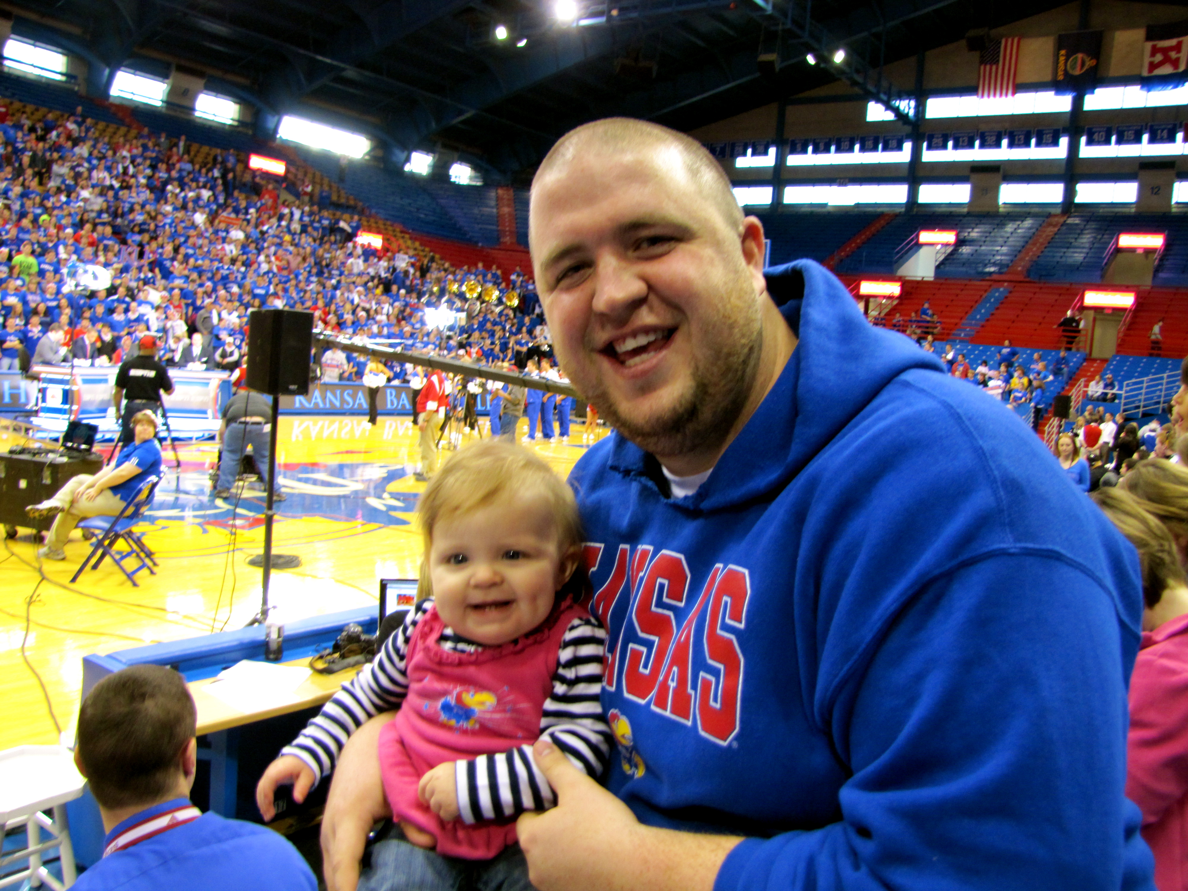 Walking into Allen Fieldhouse this morning, I said, “Honey, how much must God know you and love you to bring you to a school that has events like ESPN College Gameday!!” Josh just smiled and agreed. He really just enjoys everything about the college atmosphere. I, however, was in mourning because the guards at the door made me throw away my Dunkin Donuts coffee – SAD! Walking in and seeing thousands of students cheering for the KU basketball team gave us both a rush. I quickly forgot all about my caffeine needs. But Ruth didn’t really know how she felt about all that noise so we sat across from the students and got to watch the ESPN Analysts do their thing.