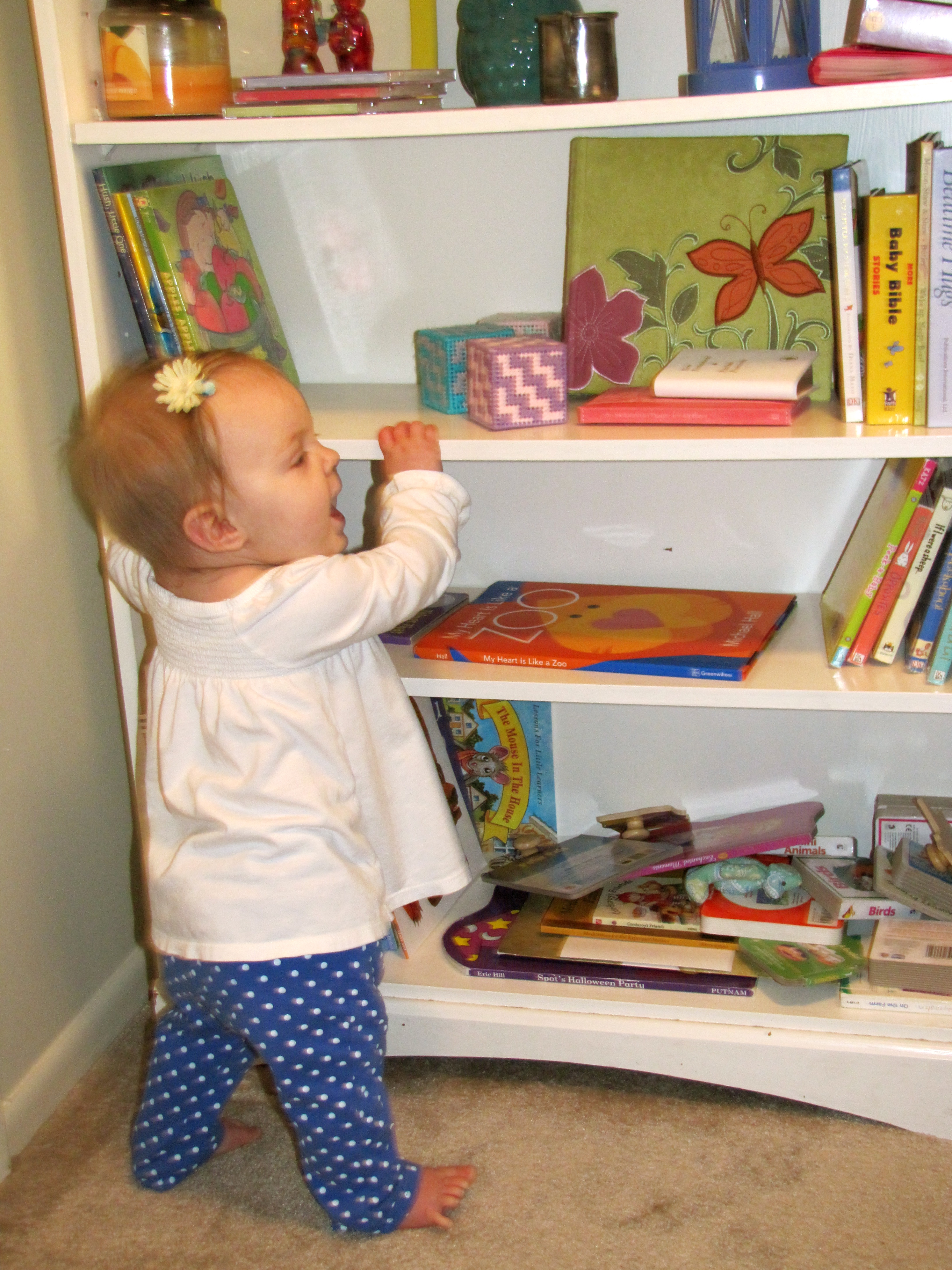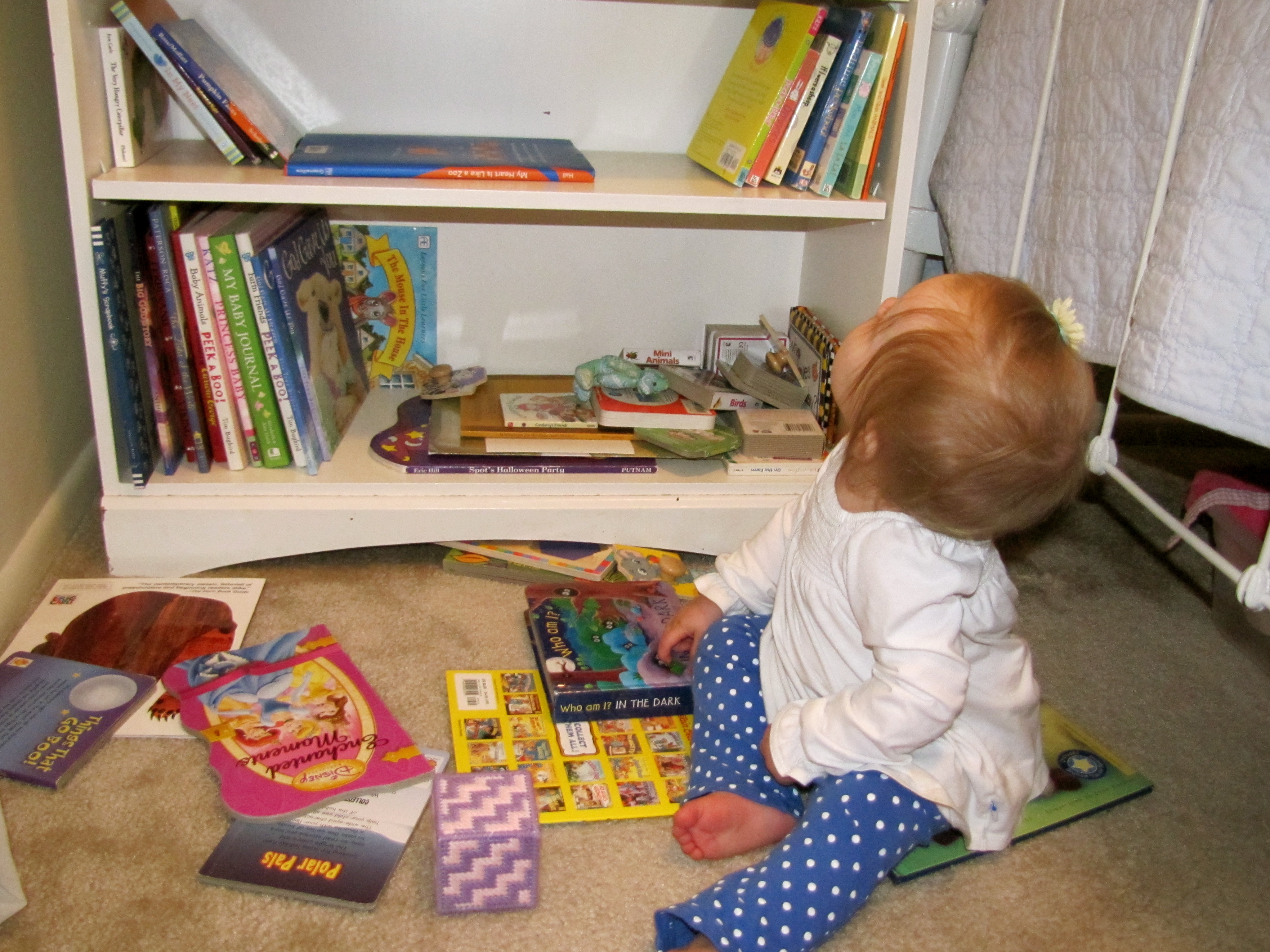 She just discovered her bookshelf in her bedroom. If only she would sit and read the books. Not for now. Instead, she takes them off of the shelves everyday.
