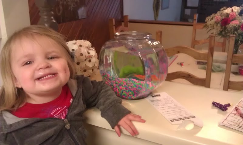 On a side note, I am praising Him for my sweet daughter that makes everything more fun. We had a very significant event happen in our lives today. Ruth and her Daddy bought a pet. A goldfish. She named the fish, “Big.” Seriously. And then she told me it was a girl. Every time the fish moves, she laughs and says, “Swim Big Fish!!!” She made dinner more fun too – how can conversation not go well with Ruth blowing bubbles at the dinner table and yelling, “Pop!” Don’t mind the snotty nose, here is a picture of Ruth and “Big.”