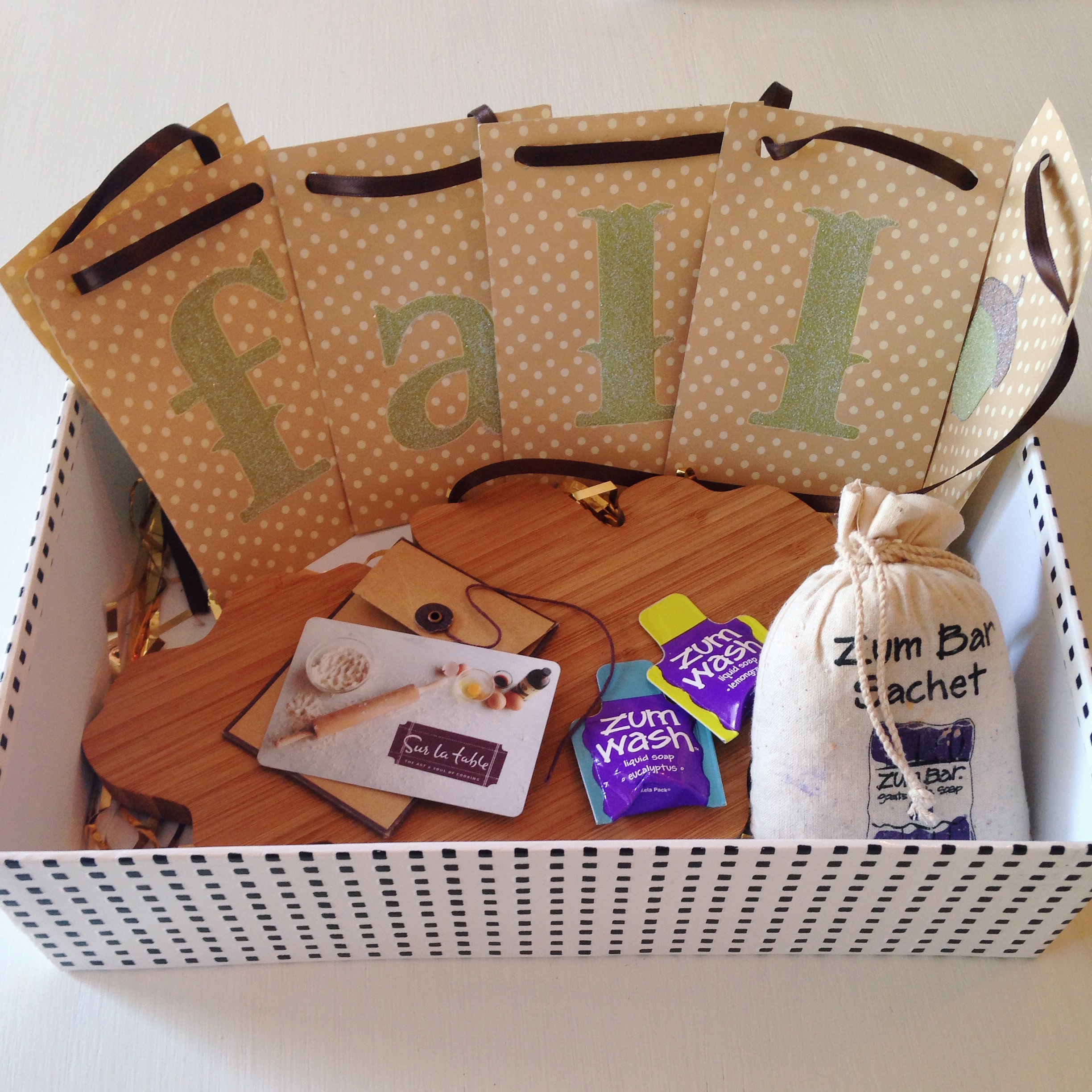 My favorite, this fall box, has a hand-made glittered fall banner (a free printable I found online), a bamboo leaf shaped cutting board, some yummy soap and a gift card