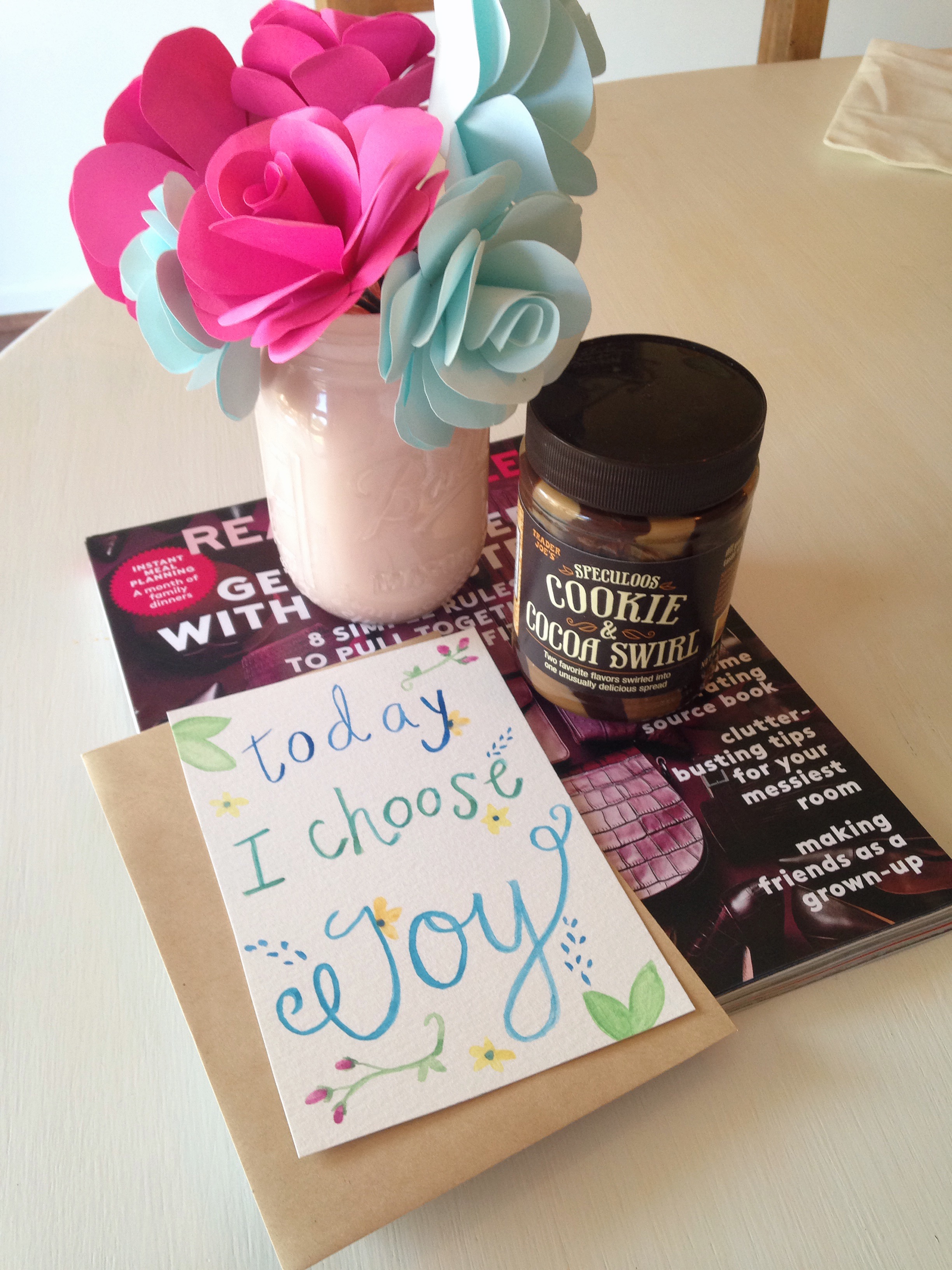 This package has a magazine, mason jar with some hand-made paper flowers, a watercolor print, and some Trader Joe’s Cookie butter (because YES!)